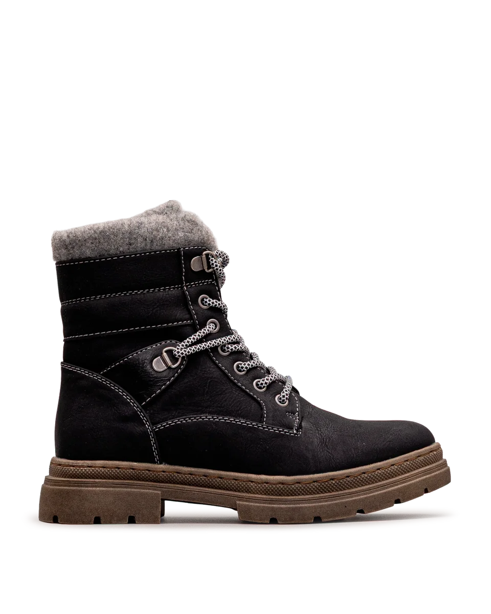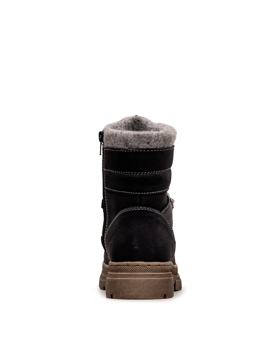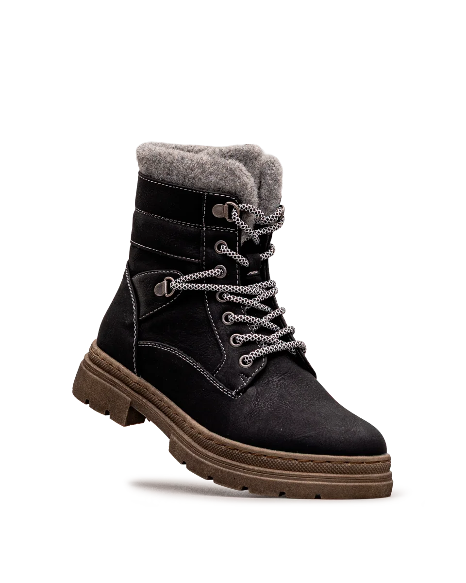 Ces bottillons noirs offrent un mélange parfait de style et de fonctionnalité. Leur col rembourré en tissu gris ajoute confort et chaleur à chaque pas. Solides et pratiques, ils conviennent aussi bien aux journées actives qu’aux sorties décontractées. Avec Bloom & Co, l’élégance se combine à un confort optimal pour l’hiver.