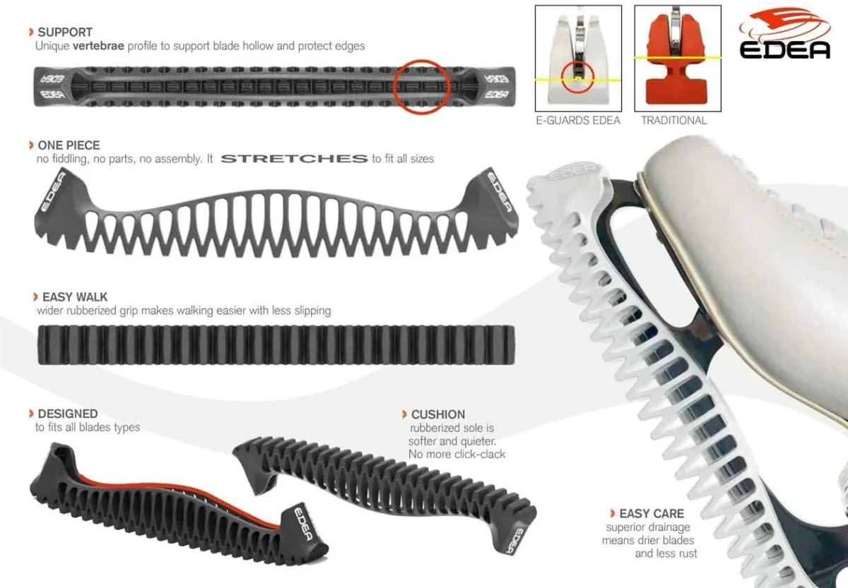 Il convient aux lames de taille libre de 8 ¾ à 10 ¼ (bien que certains patineurs l’utilisent également sur des lames de 10 ½). Pour les lames de danse, les E-Guards couvrent les tailles de lame 9 ¼ à 11.