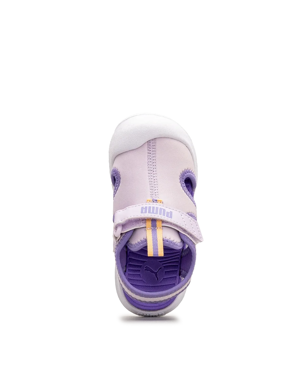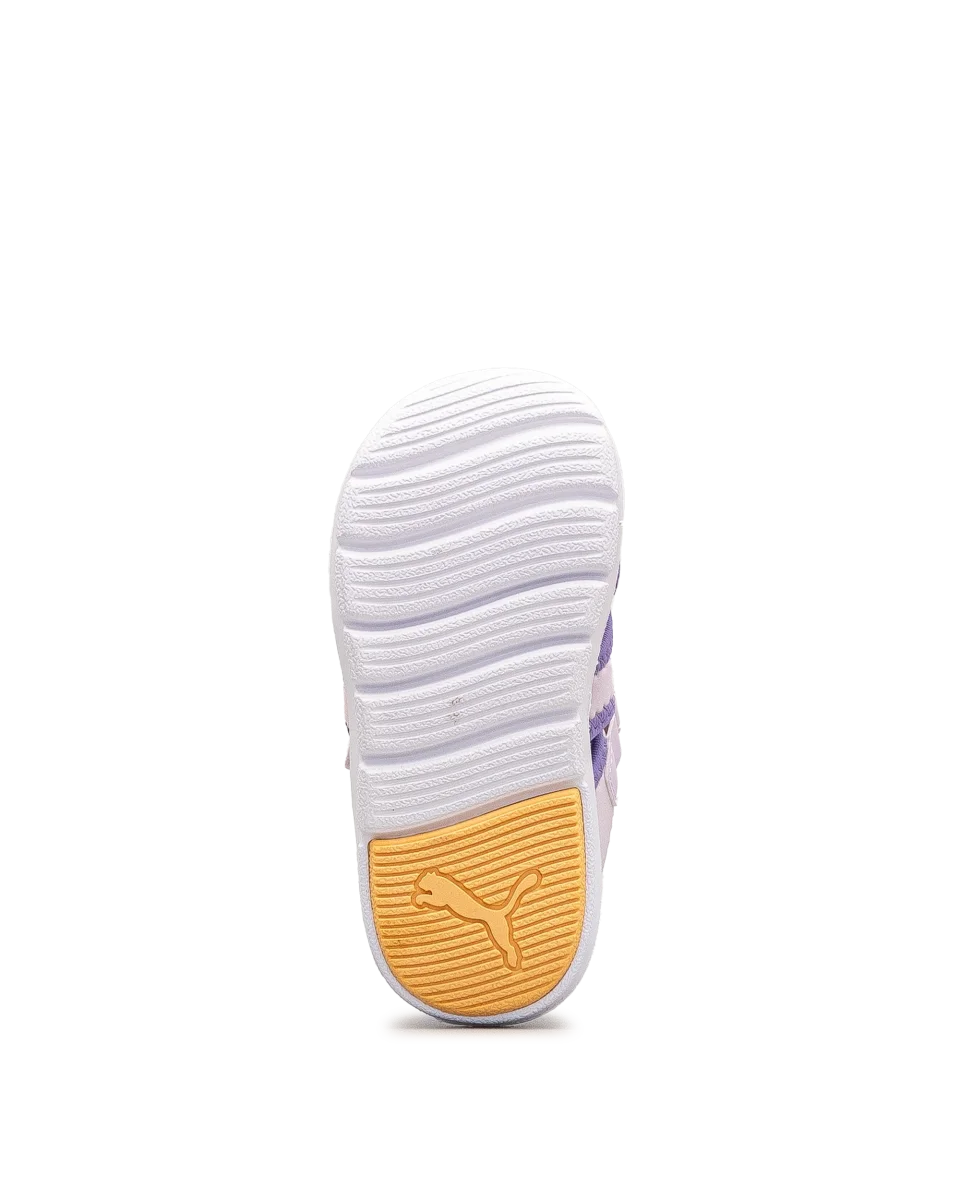 Ces sandales lilas et blanches offrent un soutien léger parfait pour l’été. Leur semelle flexible suit les mouvements naturels du pied. Faciles à enfiler grâce à la fermeture velcro, elles assurent un ajustement sécuritaire. Un modèle tout en douceur signé Puma.