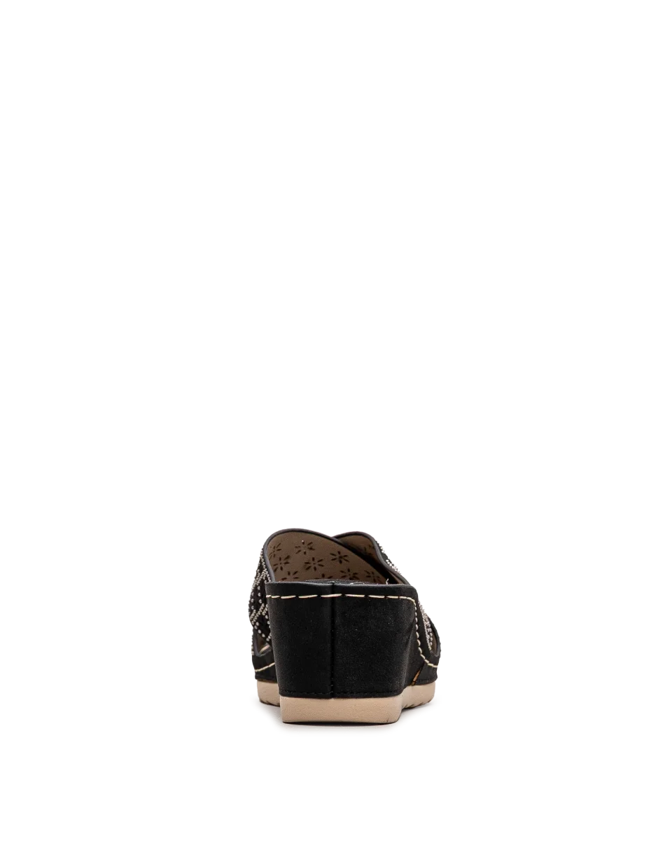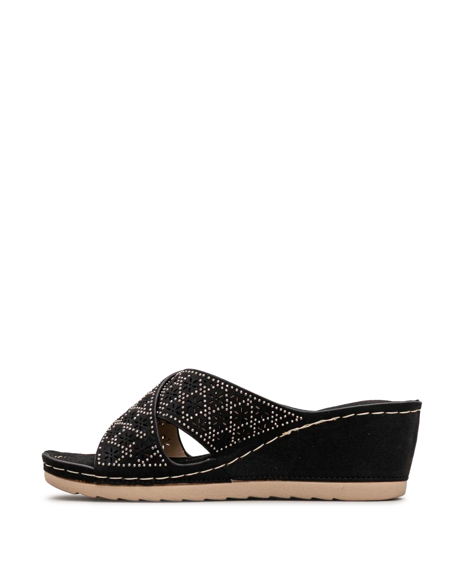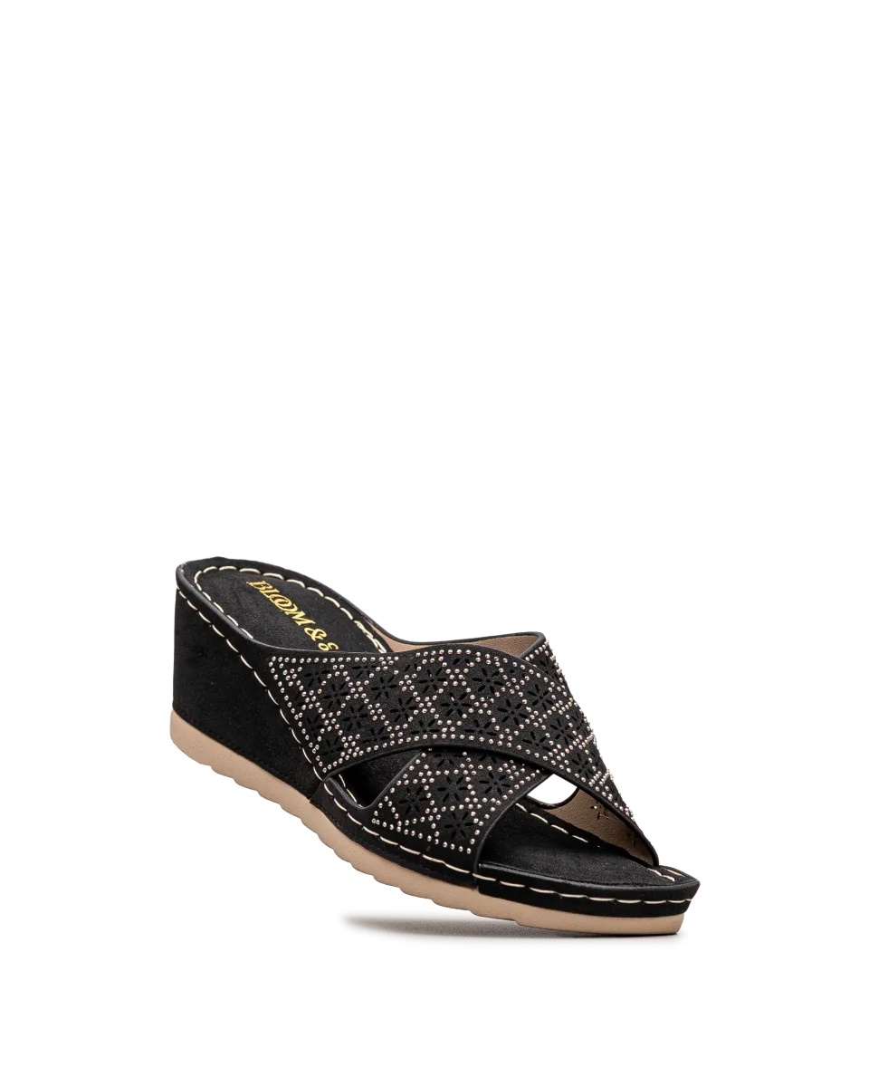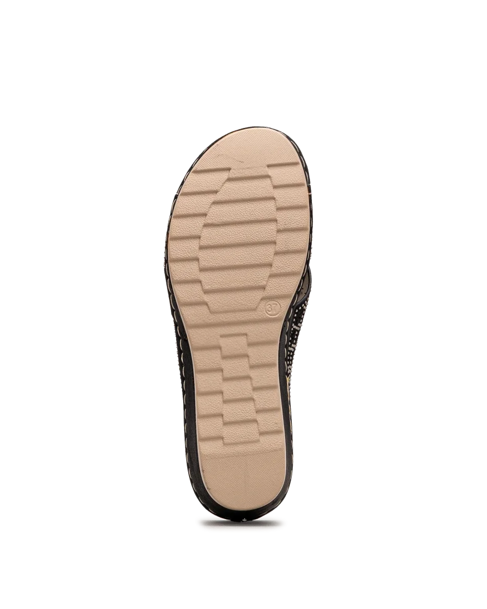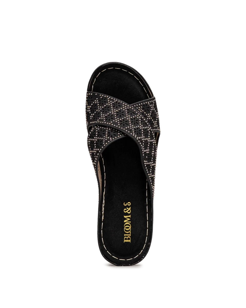 Ces sandales Bloom & Co noires combinent raffinement et confort au quotidien. Leur finition scintillante apporte une touche chic à votre allure. Faciles à porter grâce à leur semelle compensée, elles soutiennent parfaitement la démarche. Un excellent choix pour allier style et aisance.