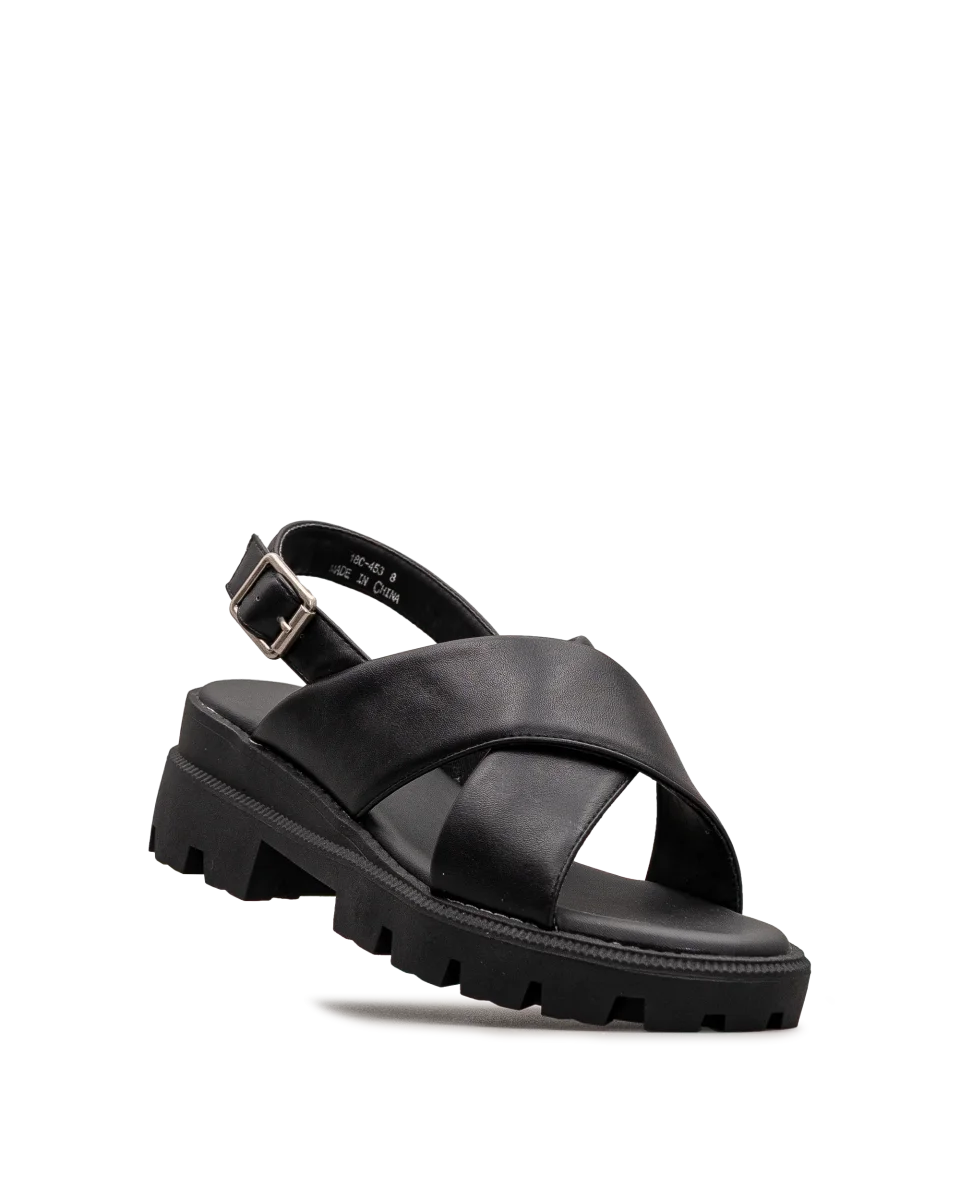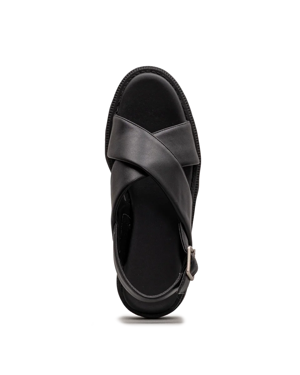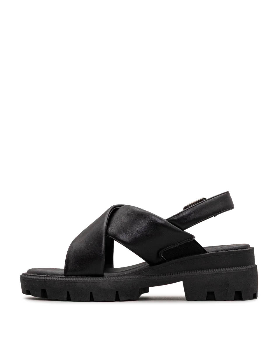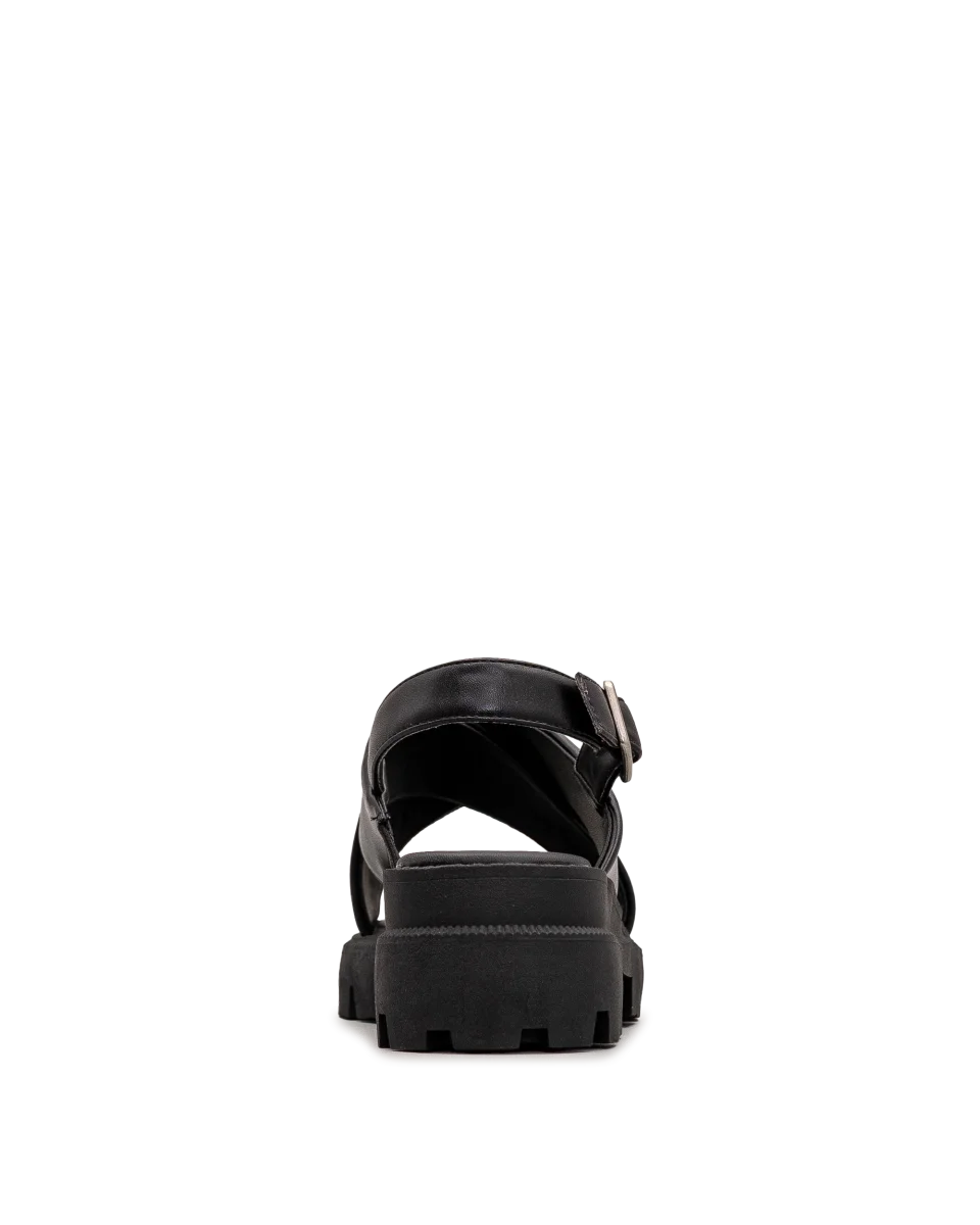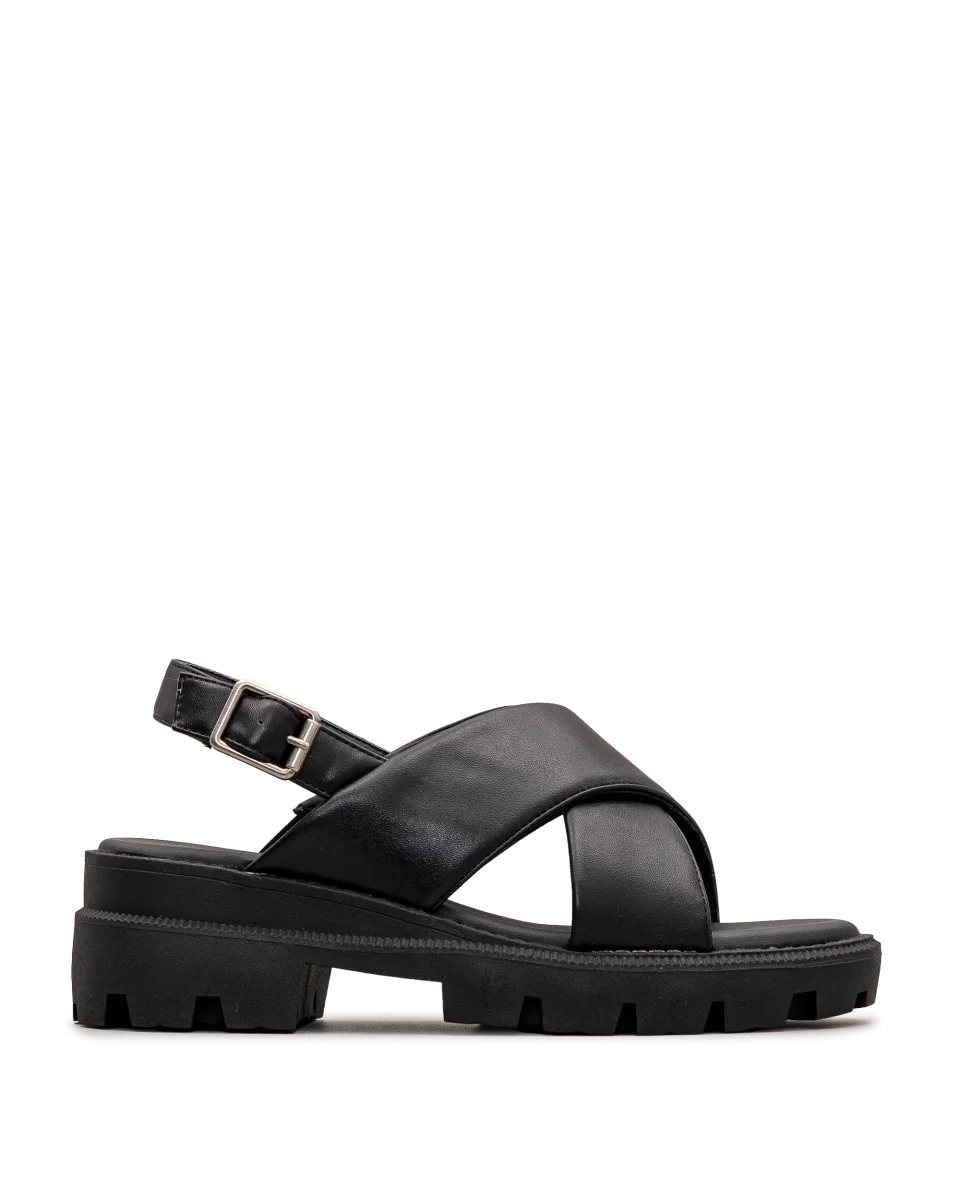 Ces sandales Bloom & Co noires allient allure contemporaine et solidité. Leurs brides croisées et leur boucle réglable assurent un maintien fiable. La semelle crantée ajoute une touche audacieuse tout en garantissant une marche stable. Parfaites pour un look moderne et décontracté.
