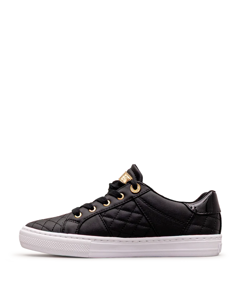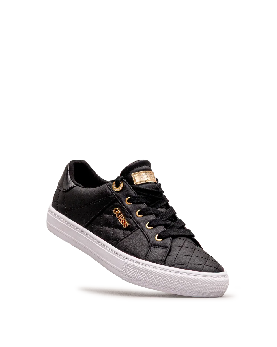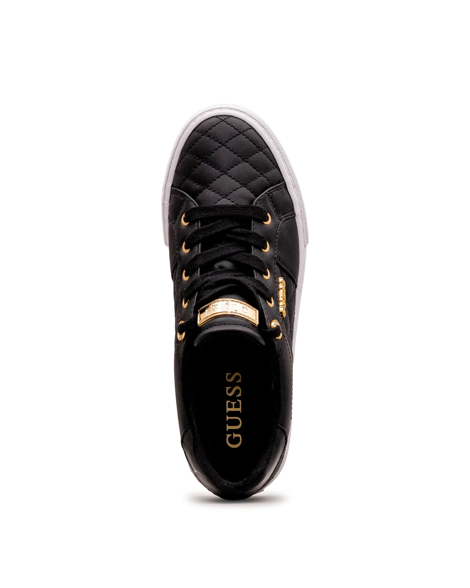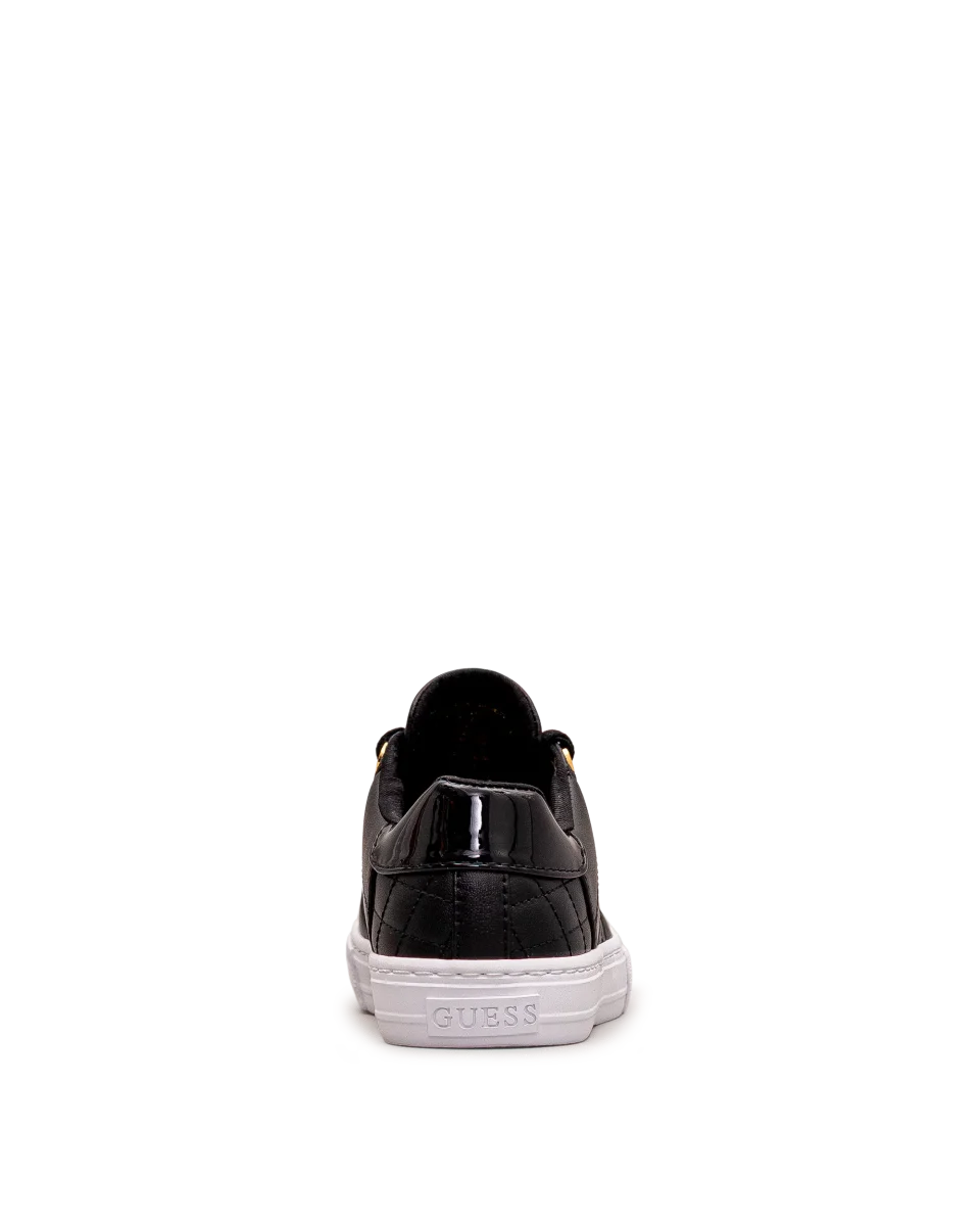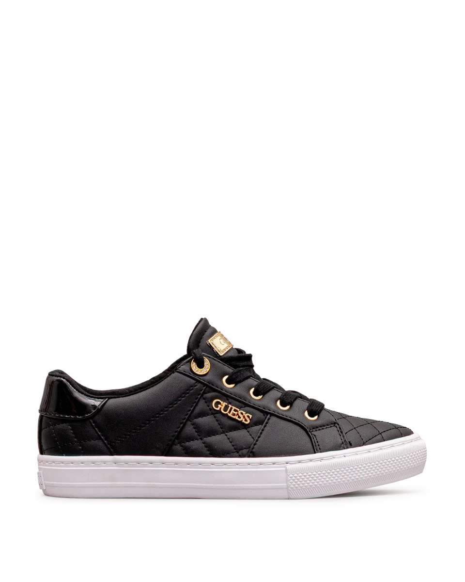 Ces chaussures noires Guess offrent un design moderne et élégant parfait pour tous les jours. Le matelassage subtil et les détails dorés accentuent leur allure sophistiquée. Leur semelle blanche contraste joliment pour un effet tendance. Une paire idéale pour un look urbain raffiné.