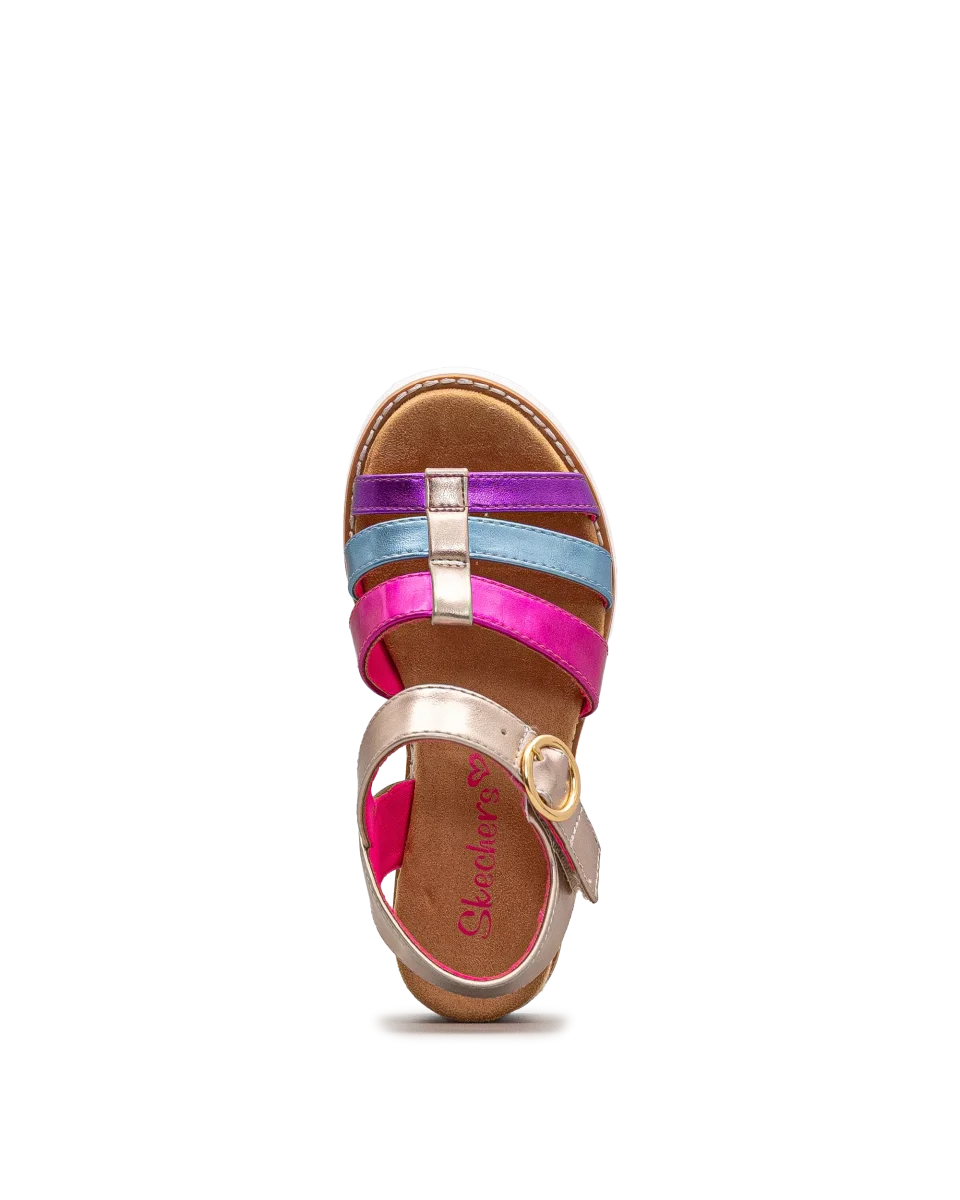 Ces sandales Skechers aux teintes vives sont parfaites pour l’été. Leur semelle plateforme et leur doublure douce assurent un confort durable. Faciles à ajuster grâce à leur boucle dorée, elles soutiennent bien le pied. Un choix coloré et pratique pour les journées ensoleillées.