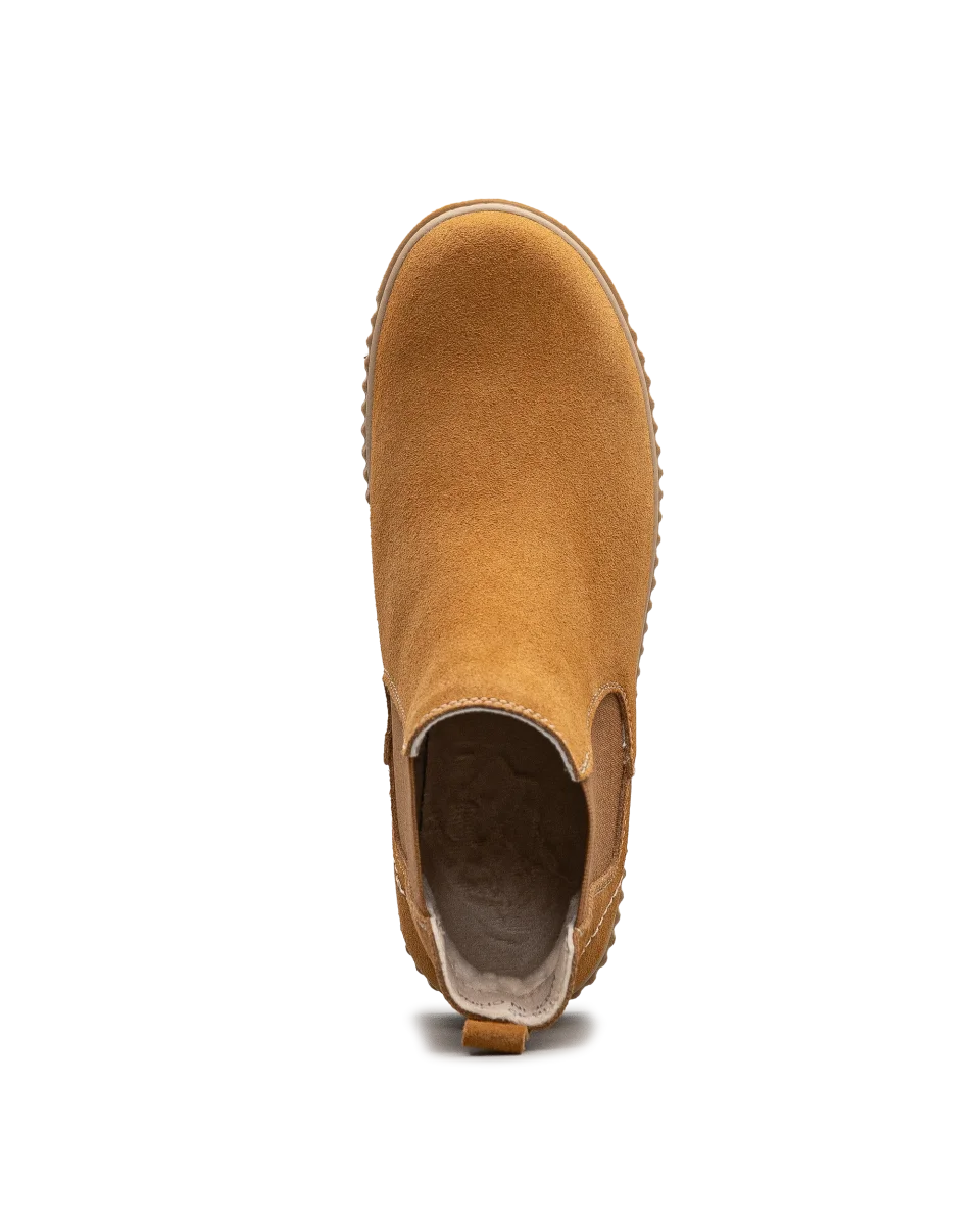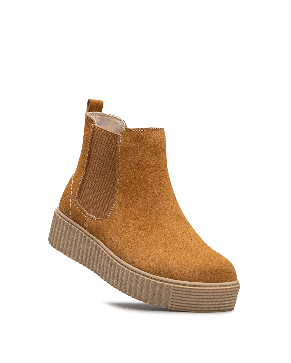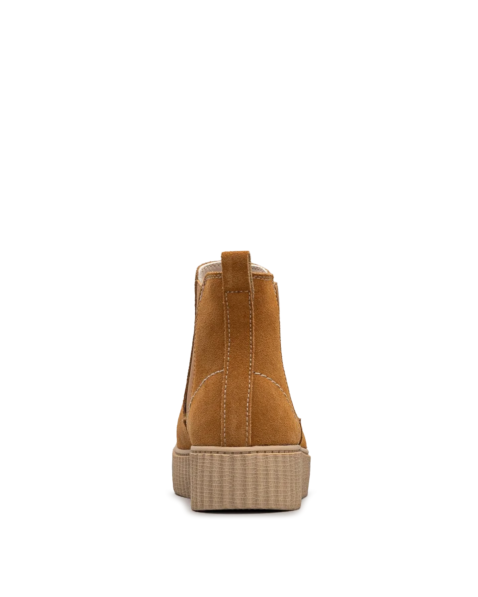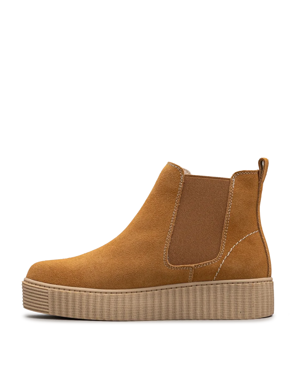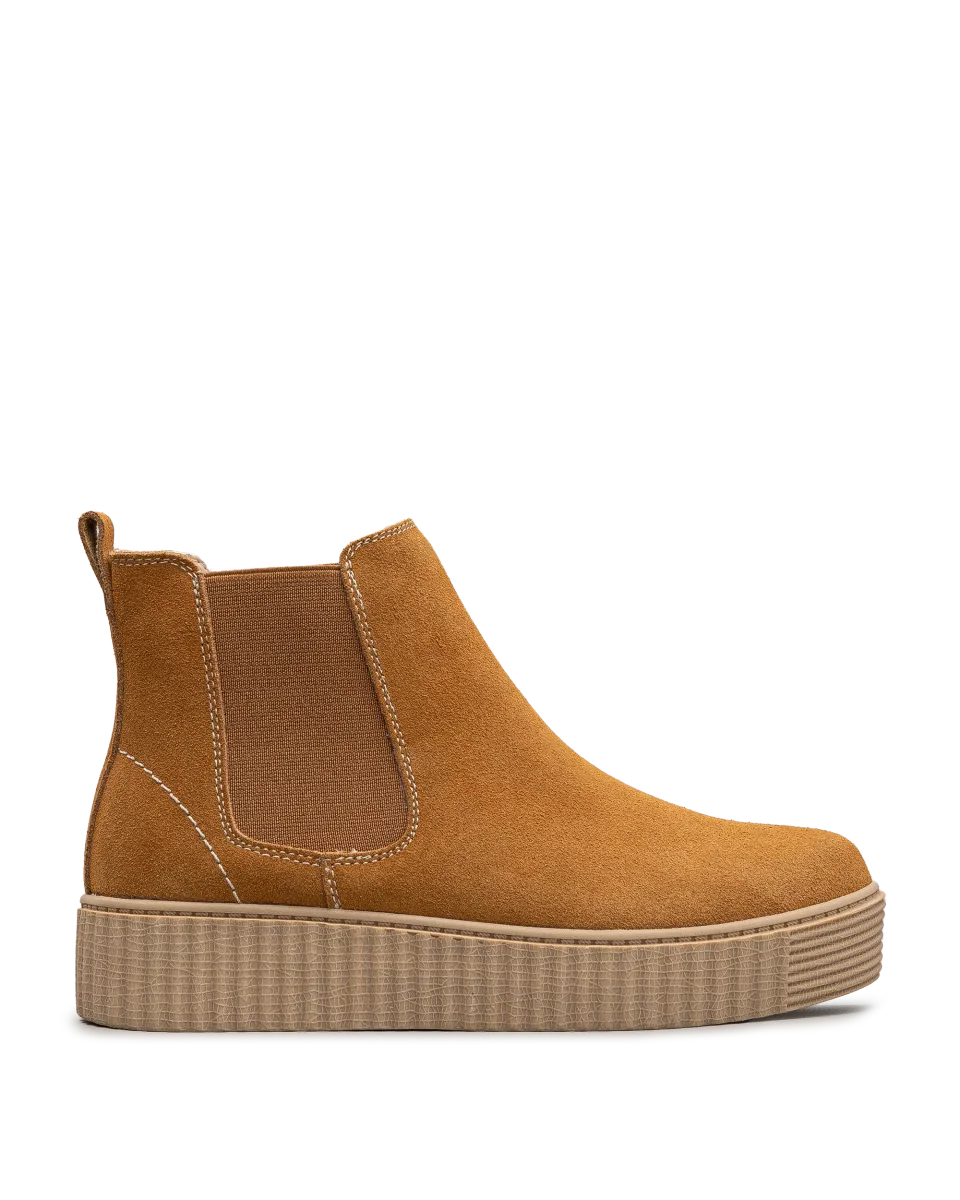 Ces bottines Chelsea pour femme en suède tan sont la touche chic et décontractée parfaite pour vos tenues d’automne. Fabriquées en suède doux, elles offrent une finition soignée et une durabilité accrue. La semelle plateforme ajoute une touche moderne tout en assurant confort et stabilité à chaque pas. Les panneaux élastiques latéraux emblématiques du style Chelsea permettent un enfilage facile et rapide. Que ce soit pour une journée en ville ou une sortie décontractée, ces bottines s’adaptent à tous les styles tout en vous gardant à l’aise.