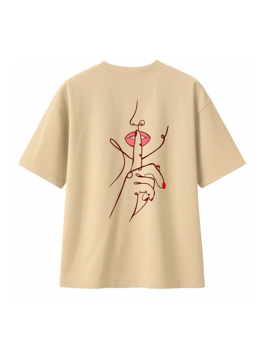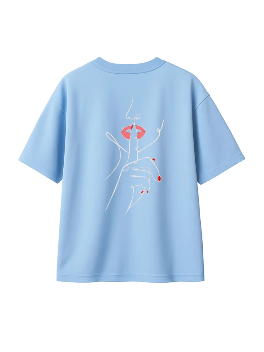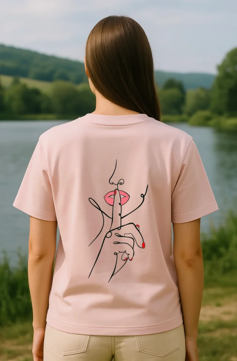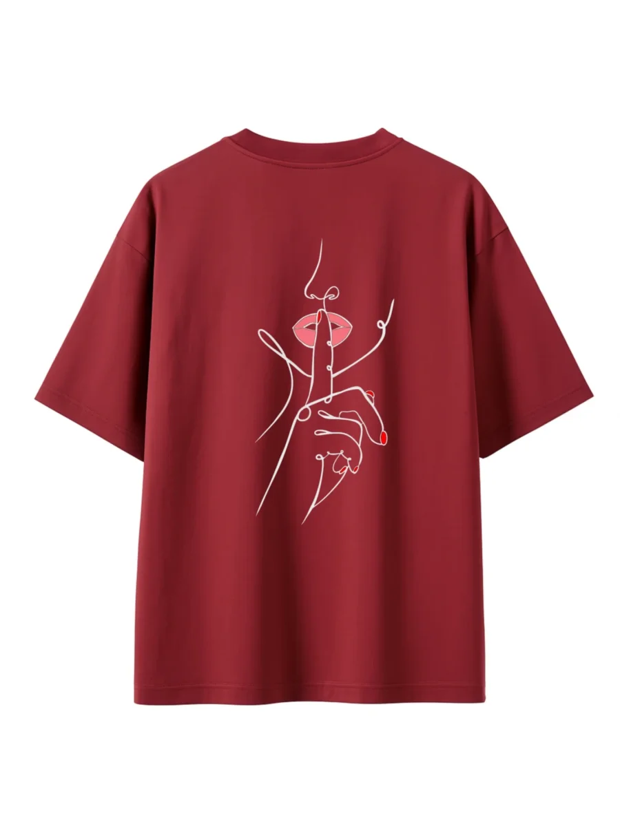 Un doigt tendu, délicat, posé sur des lèvres rouges entrouvertes. Ce n’est pas une interdiction, c’est une invitation. Une main fluide, dessinée d’un seul trait, nous demande doucement mais fermement de ralentir. Dans un monde saturé de bruit et d’images, ce geste devient un cri silencieux.