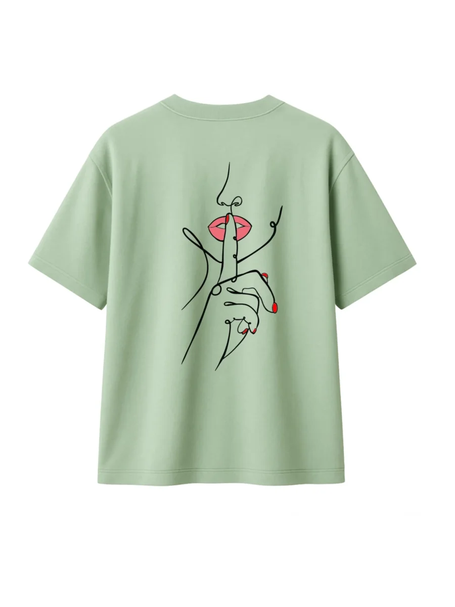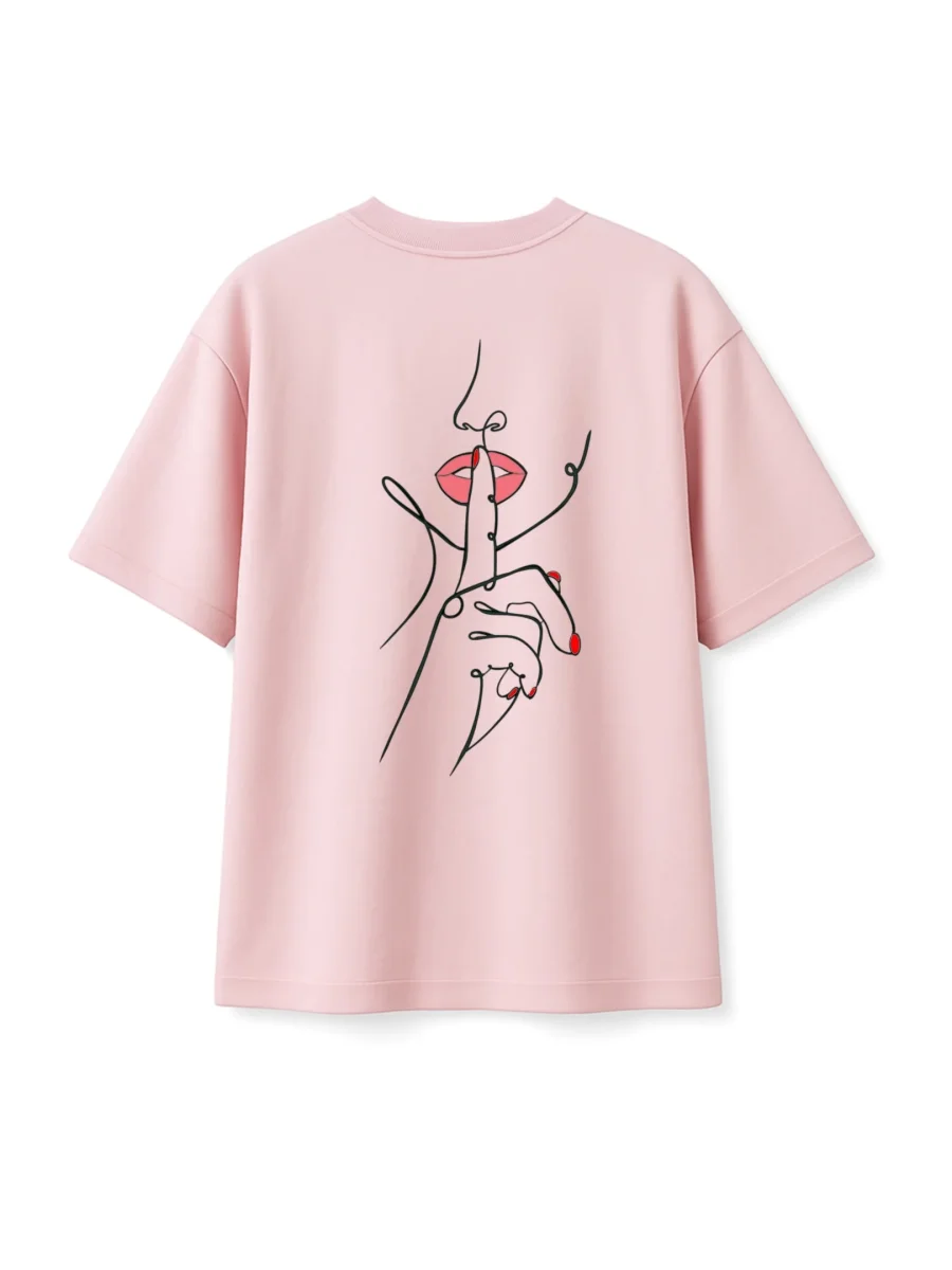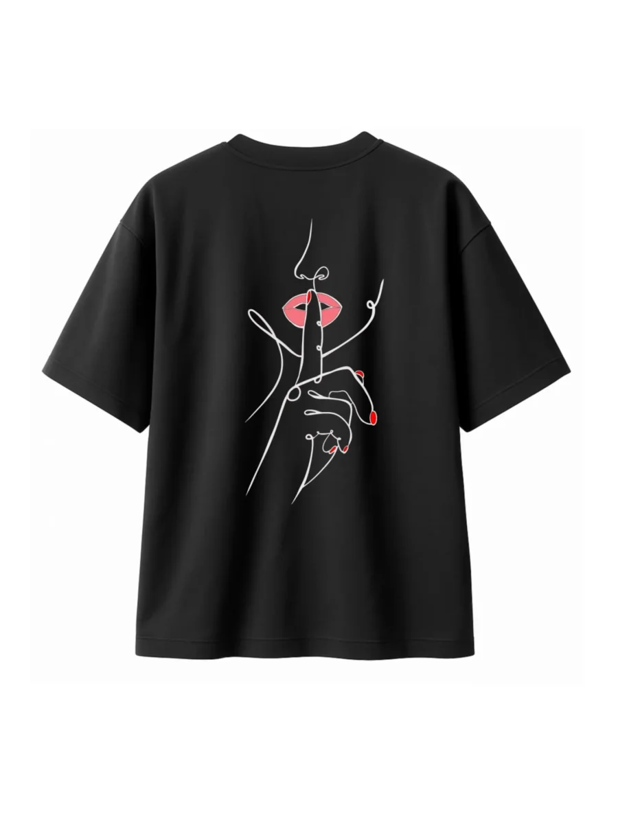 Un doigt tendu, délicat, posé sur des lèvres rouges entrouvertes. Ce n’est pas une interdiction, c’est une invitation. Une main fluide, dessinée d’un seul trait, nous demande doucement mais fermement de ralentir. Dans un monde saturé de bruit et d’images, ce geste devient un cri silencieux.