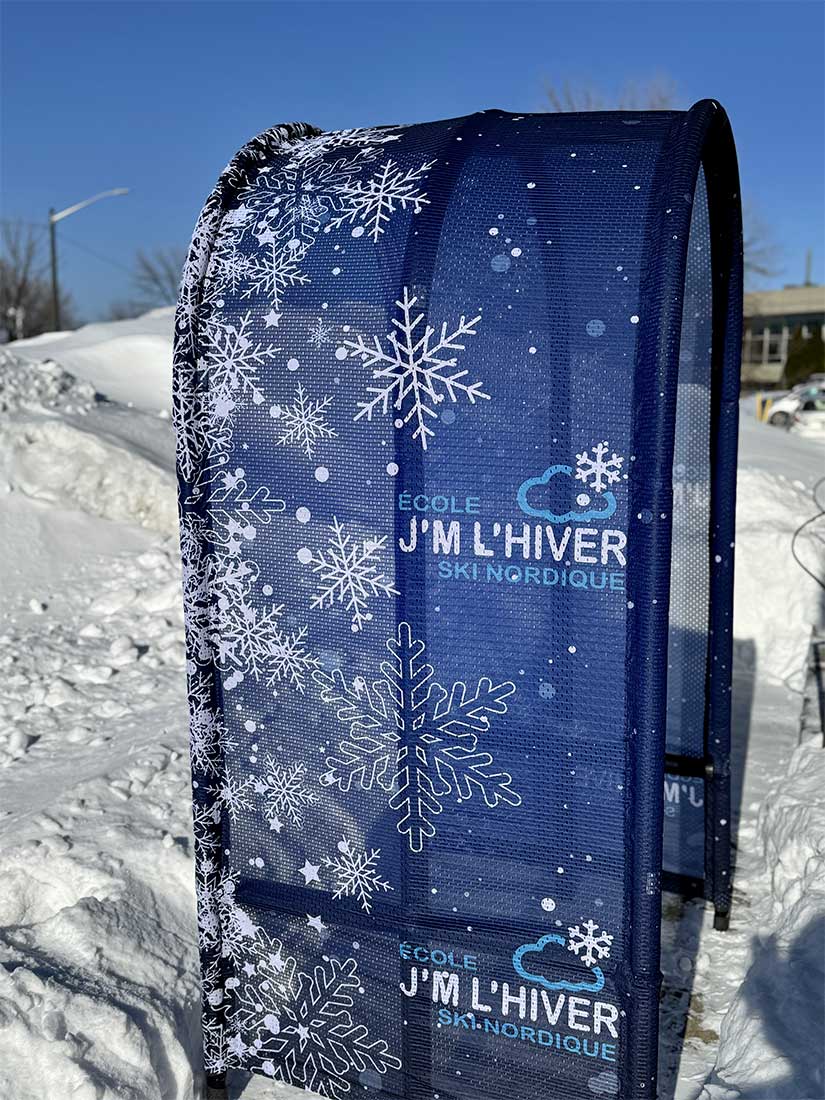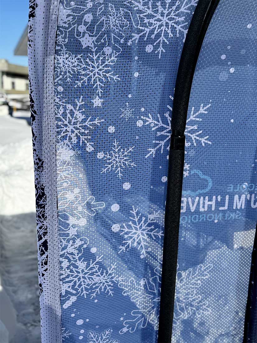 Bannière en mesh imprimée facile à installer. Laisse passer le vent et résiste aux intempéries.
