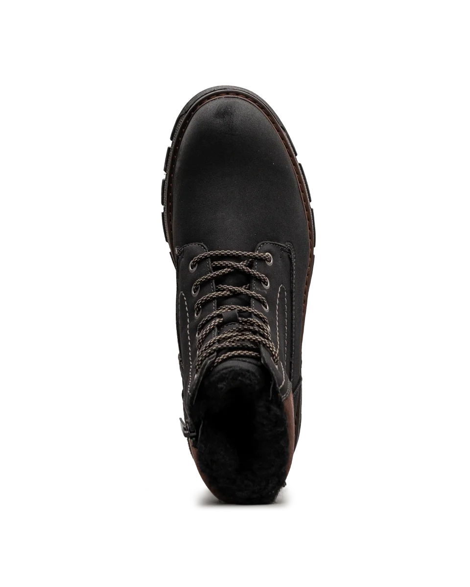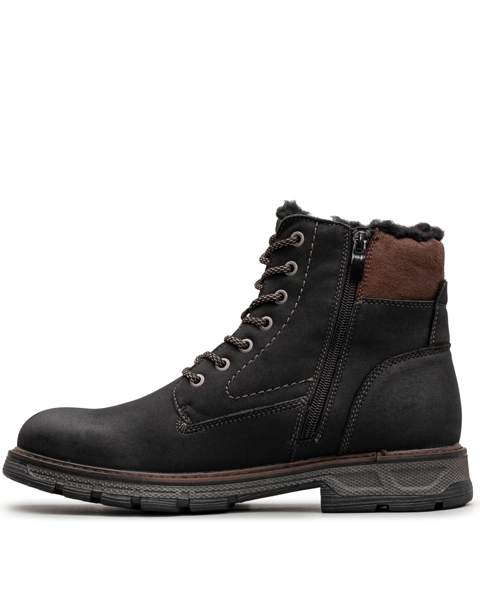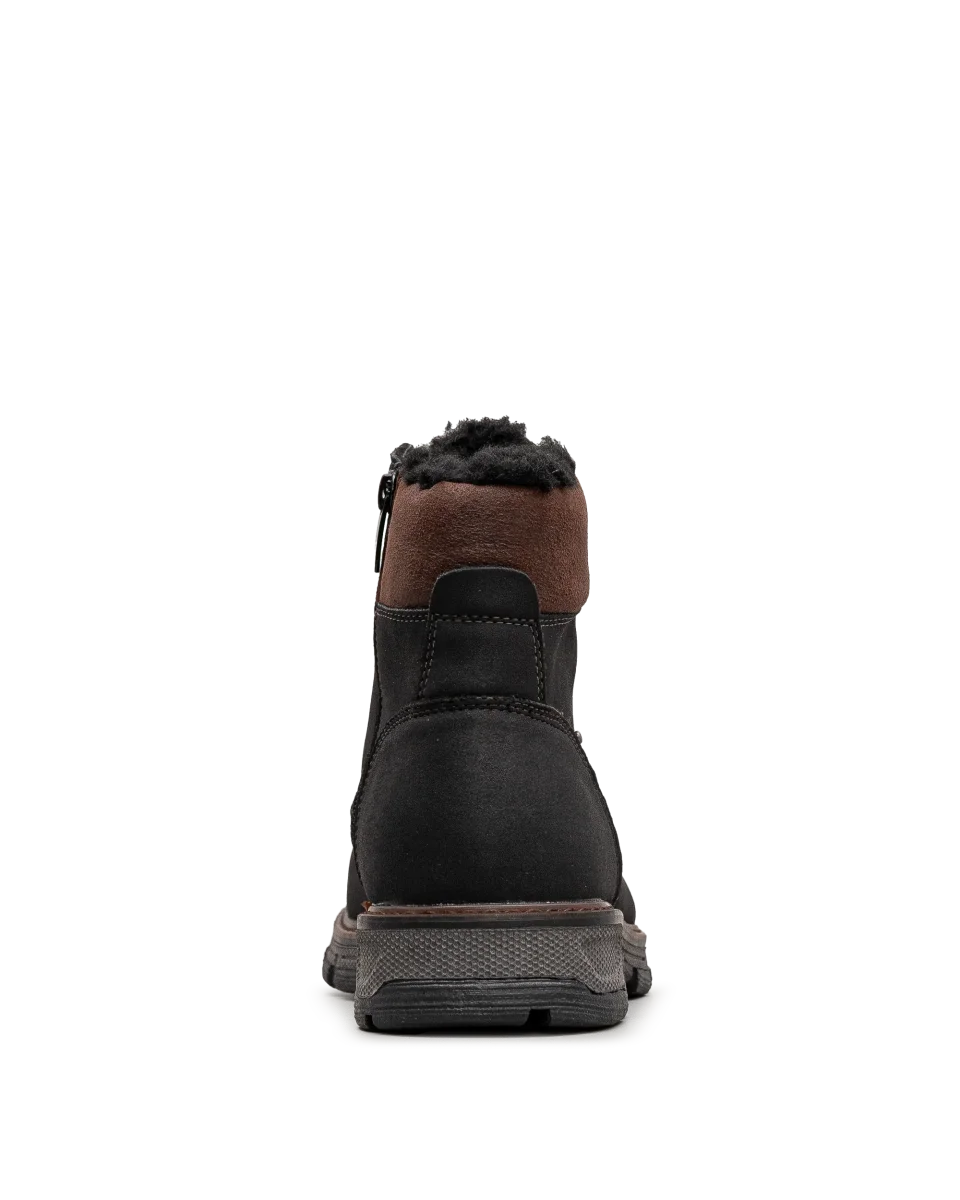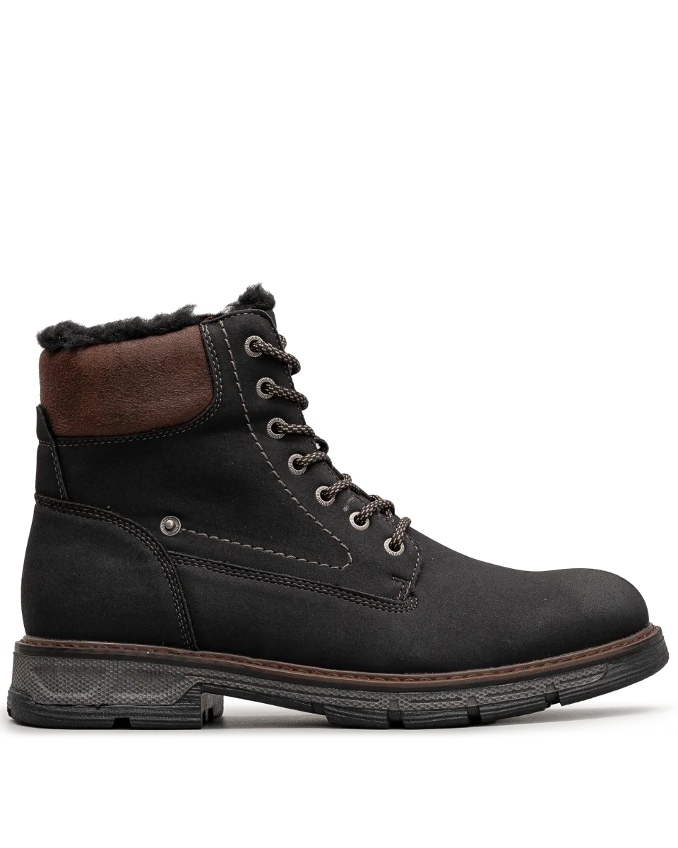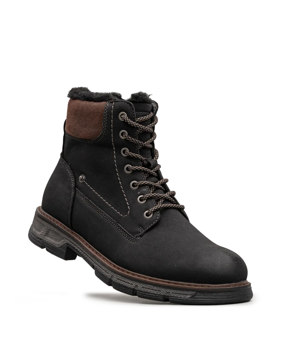 Ces bottes pour hommes, fabriquées en cuir vegan noir rustique, allient style et robustesse. Conçues pour résister aux intempéries, elles sont doublées d’un matériau isolant qui vous garde au chaud durant les mois d’hiver. Le col rembourré et la semelle épaisse assurent un confort optimal pour de longues marches, tout en apportant un style décontracté et élégant à votre look quotidien. Les détails de coutures apparentes ajoutent une touche artisanale, et les lacets bicolores renforcent leur allure intemporelle. Parfaites pour les sorties en ville ou les escapades en pleine nature, ces bottes sont un incontournable pour la saison froide.